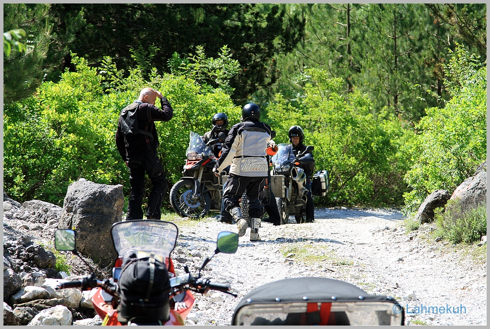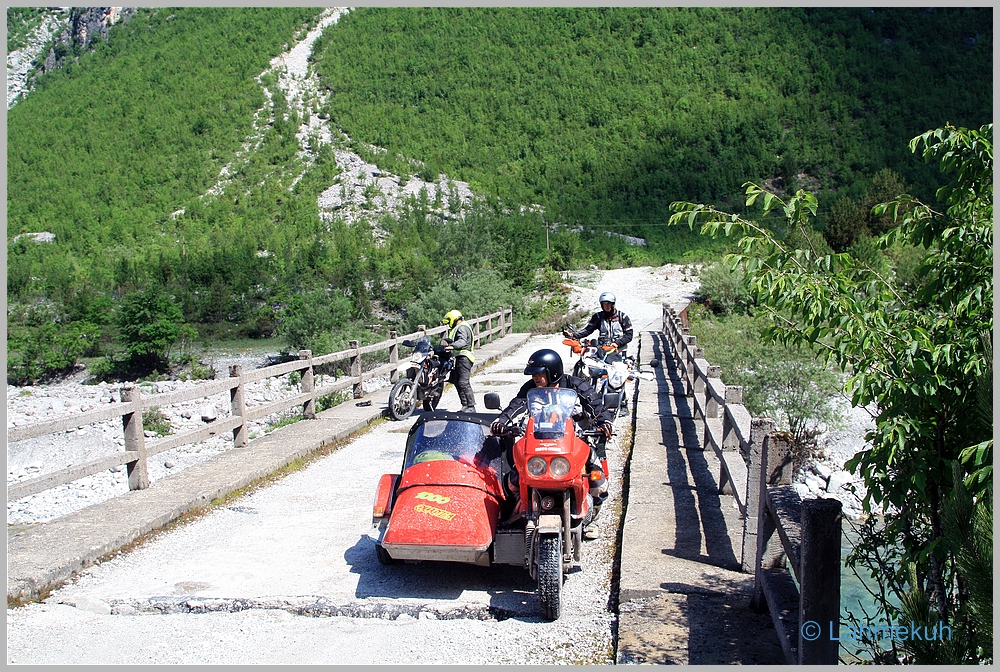 Nach ca. 10 KM hielten wir für ein Brückenfoto an und trafen auf die Dreiergruppe tschechischer Enduristen, die uns aufgrund des aktuellen Wegezustands von der weiteren Befahrung der Route, insbesondere wegen des Gespanns, dringend abrieten. So siegte bei uns die Vernunft und wir drehten zu fünft um und fuhren zurück zu Jimmys Gästehaus. Bernd war ja bereits deutlich weiter und fuhr die Strecke durch.