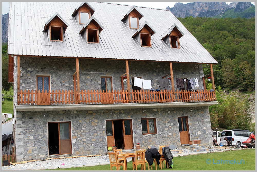 Im Laufe des Vormittags stellte sich heraus, dass die Reparatur des Gespanns wohl doch deutlich länger dauern würde, als ursprünglich erhofft. Eine Abfahrt aus Theth in Richtung Shkoder am 05.06. mit der ganzen Truppe (außer Bernd, denn der war ja Tags zuvor die Südroute vollständig gefahren und "trieb sich anderweitig herum") wurde Stunde um Stunde unwahrscheinlicher. Währenddessen zogen wieder bedrohlich wirkende Regenwolken am Horizont auf. Der Gedanke, die sogenannte "Schotterautobahn" der Theth-Nordroute bei Regen hinauffahren zu müssen, führte nicht gerade zu lustvollen Gefühlsanwandlungen. Ganz im Gegenteil: Marc, Max und ich beschlossen daher für uns, bei Rückkehr von Tornantes Michael und Alen und nachAbstimmung mit den beiden so schnell als möglich Theth zu verlassen und in Shkoder ein Quartiet zu suchen.