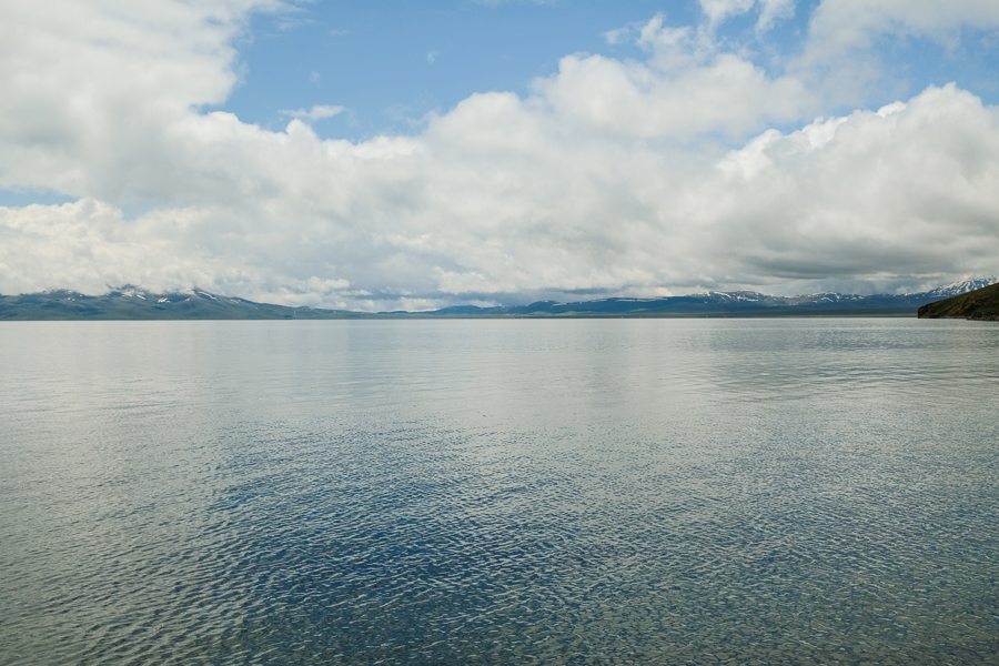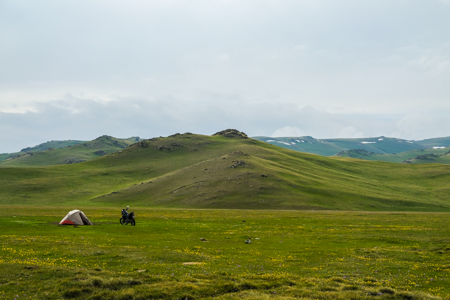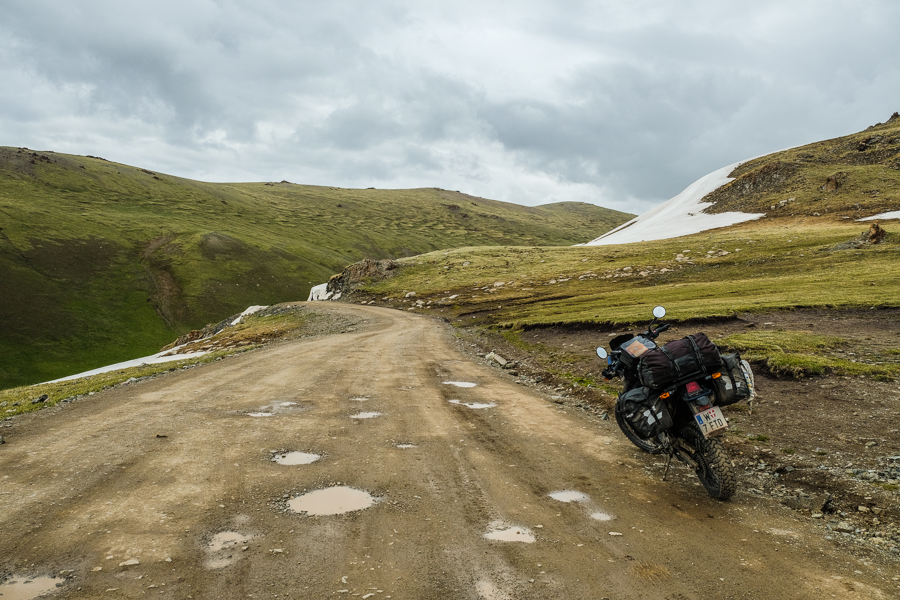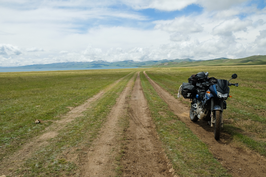Die Strecke hierher war wieder ein Traum. Die Strecke gibt es zwar auf Google Maps nicht aber mein Navi hat sie vorgeschlagen und ich bin heilfroh, dass ich sie doch genommen habe. Verunsichert bin ich an einer Kreuzung im Dorf stehen geblieben, aber ich konnte mich mit neugierigen Kindern insoweit verständigen, dass ich es riskieren konnte. Der Anfang war sehr taff und die Straße ausgewaschen. Mit der Zeit wurde sie aber immer besser und führte durch ein kleines Tal über einen 3200 Meter Pass rüber zum See. Die Lichtstimmung war wunderbar schön. Am See habe ich mir dann einen Platz zum Campen gesucht, auch wenn es erst 14:30 war. Der gestrige Tag war lang und die Offroadstrecke von heute war auch relativ anstrengend. Außerdem wollte ich unbedingt am See campen. Nachdem das Zelt aufgebaut war, fing es an zu Donnern und zu Blitzen. Der Regen ließ nicht lange auf sich warten und so sitze ich seit zwei Stunden im Zelt. Es hat ungefähr 12 Grad und ich bin eigentlich ganz froh, nicht am Motorrad sitzen zu müssen.
