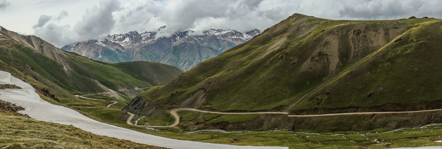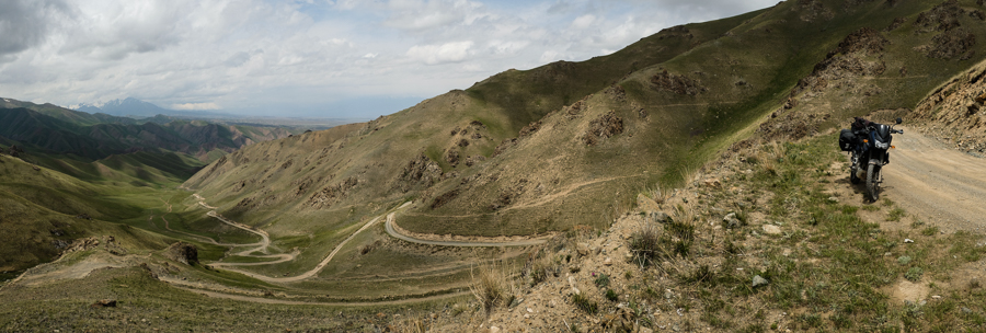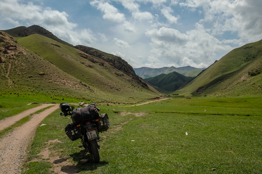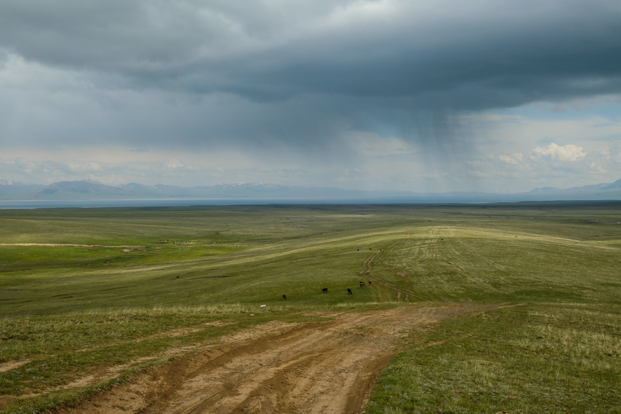 Ich musste mich rund um den Song Kol See förmlich kämpfen. Der Regen hatte die Erde zu einem Eislaufplatz verwandelt. Vorallem die Lacken sind unglaublich tückisch gewesen. Extreme rutschig. Und mir war teilweise die nasse Wiese lieber als die ausgewaschene Erde der Straße. Mal ist das Heck weggerutscht, mal das Vorderrad. Die Straßen waren auch extrem steil, die Hügel hinauf und hinunter. Einmal war ein echt komischer Bachübergang. Er war nicht sonderlich tief, aber uneinschätzbar. Ein Mann hat gemeint ich soll irgendwie anders fahren, aber ich habe nicht ganz verstanden warum. Der Bach war weder sonderlich tief, noch was der Übergang lang. Ich habe mich dann für den Weg zwei Meter daneben entschieden. Weniger tief, weniger lang und ein fataler Fehler. Ich bin ungefähr einen Meter weit gekommen, dann bin ich mit beiden Rädern bis zur Achse im Morast gesteckt. Mein Zaungast hat geflucht und mit Hilfe eines weiteren jungen Mannes konnten wir Fifi aus dem Gefängnis befreien. Der Zaungast hat noch mehr geflucht, da seine Schuhe dreckig und seine Füße nass wurden. Er hat dann auch weiter auf russisch auf mich eingeredet, aber ich habe leidenden Wort verstanden. Ich habe dann einen anderen großen Umweg genommen und es hat geklappt.