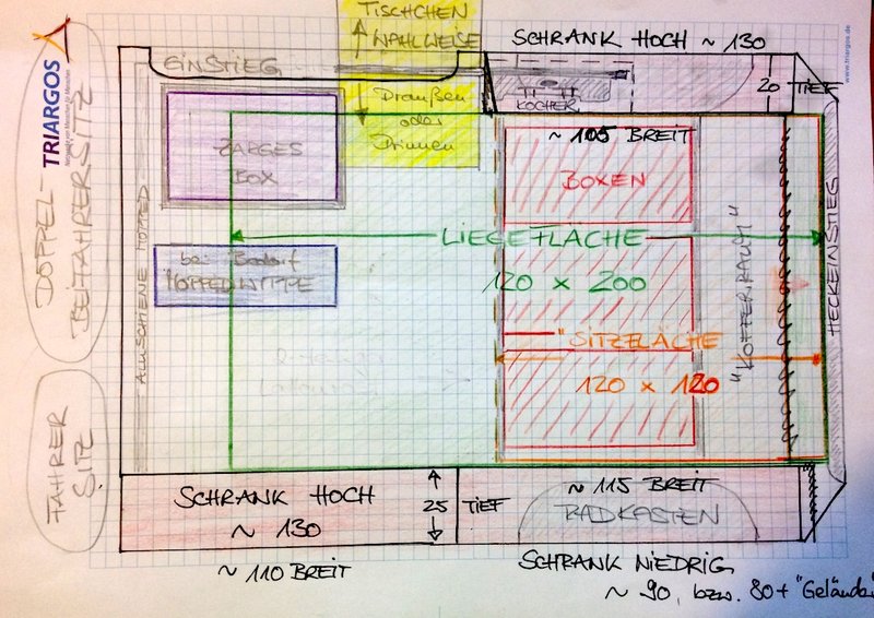 Die Liegefläche will ich definitiv quer geteilt haben, um tagsüber ohne großen Aufwand eine Sitzgelegenheit, ein 'Sofa' im Bus zu haben und davor dann auch noch bissi Platz - denn wenn das Moped mitkommt, wird die Liegefläche ja komplett entfernt und das Dachzelt kommt zum Schlafen drauf, wie gehabt .. das hat sich ja schon bewährt. Außerdem brauch ich eine Sitzgelegenheit für den netten Herrn vom TÜV