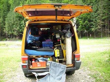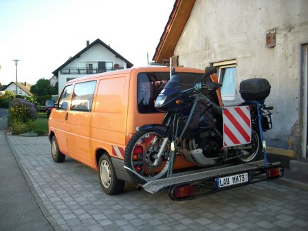 Steht das Moped erst mal drin, kann ich das Bett wieder runterklappen und mit Moped schlafen- geht natürlich nur wenn man alleine unterwegs ist. Sollte Sozia mitkommen, muß Moped auf Hänger oder Heckträger, der kann beim T4 bis zu 250kg tragen. Dann wird an das Klappbett noch ein Teil über einfach Türscharniere eingehangen und schon haben wir ein Doppelbett.