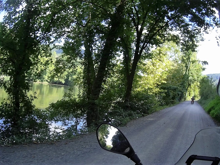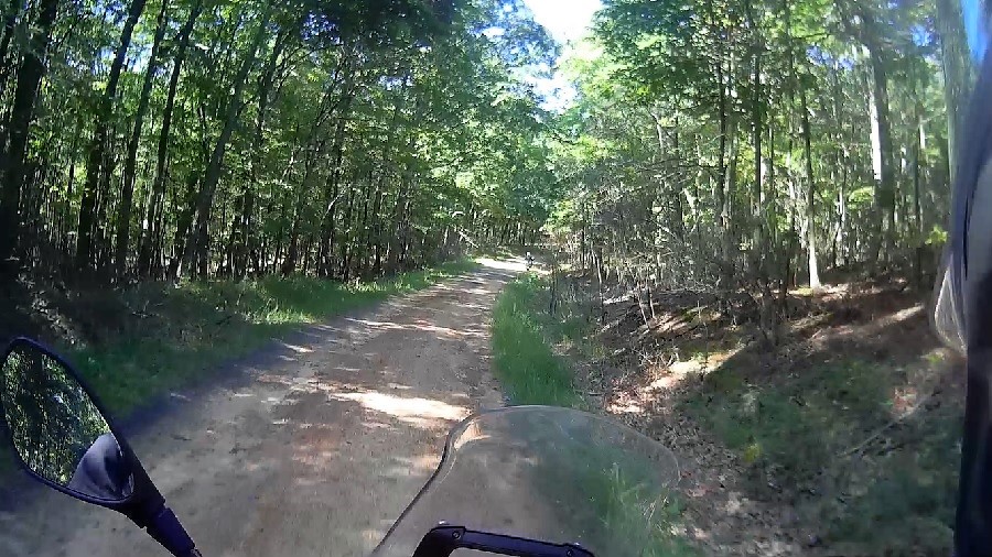 Die Strecke heute war zunaechst wundervoll; eine als “Jeep-Trail” betitelte Backroad, die mit sehr engen Kurven, vielen Steigungen und Gefaellen mit stetig wechselnden Beschaffenheiten fuer Abwechslung sorgte. Pfuetzen, kleinere Baeche, Auswaschungen und im Weg liegende Schildkroeten zwangen zum Aufpassen. Wir wissen ja dass man vorausschauend fahren muss und nicht den Blick direkt vors Vorderrad richtet. Hintern oder Fussraste melden zurueck was die Augen ein paar Sekunden zuvor registriert haben. Erinnert ein bischen an frueher in der Klavierstunde … man hoert die (falschen) Noten, die man kurz zuvor vom Blatt gelesen hat … .