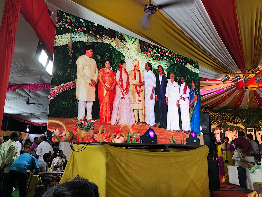 Der weitere Ablauf ist im Prinzip schnell erzählt: Hari, und später auch Gayathri, wurden auf die Bühne gestellt und durften sie rund 4 Stunden (!) nicht mehr verlassen. Von links kamen Gäste auf die Bühne, übergaben Geschenke, stellten sich neben das Brautpaar, wurden fotografiert ... und Abmarsch. Die beiden taten mir sehr leid. Und ich ziehe meinen Hut vor der Ausdauer.