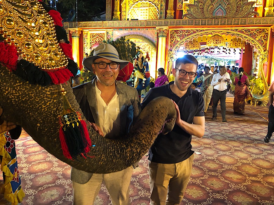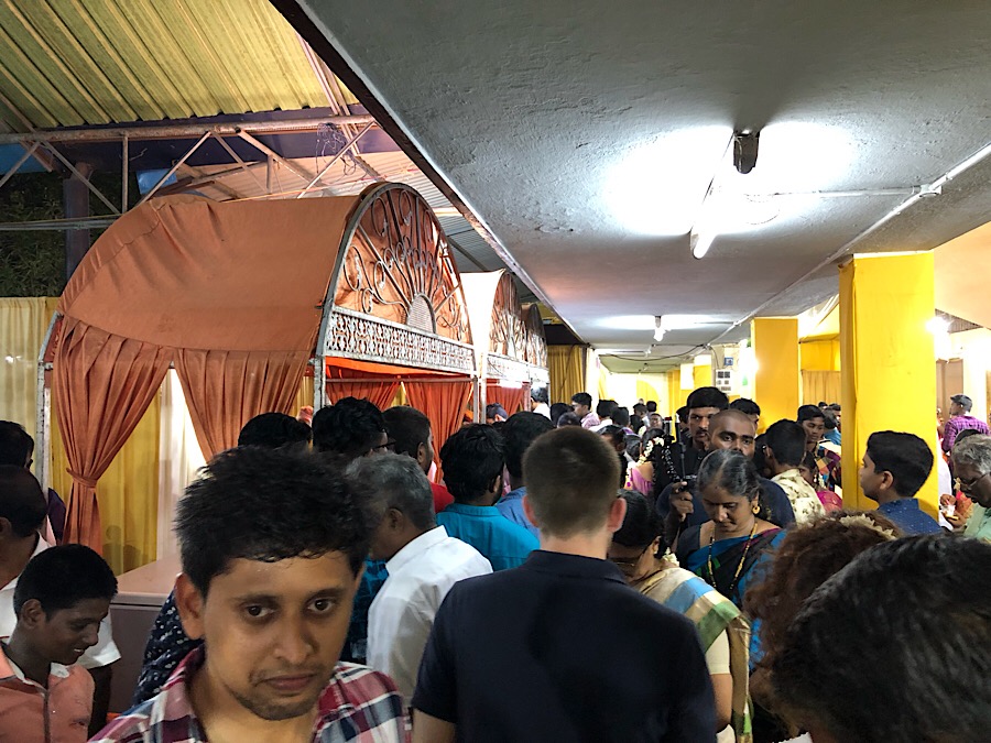 Zur Prozession ist noch zu sagen: nach etwa 150m auf der Strasse zum Tempel bogen wir in eine Hauptstraße ein, auf der der ganz normale Verkehr ablief. Zur Musik kam also noch das übliche Gehupe und jeder (JEDER!) versucht irgendwie an der Hochzeitsgesellschaft vorbei zu kommen. Ein paar Minuten geriet der Tross ins Stocken, weil ein Lkw überholen wollte ....
