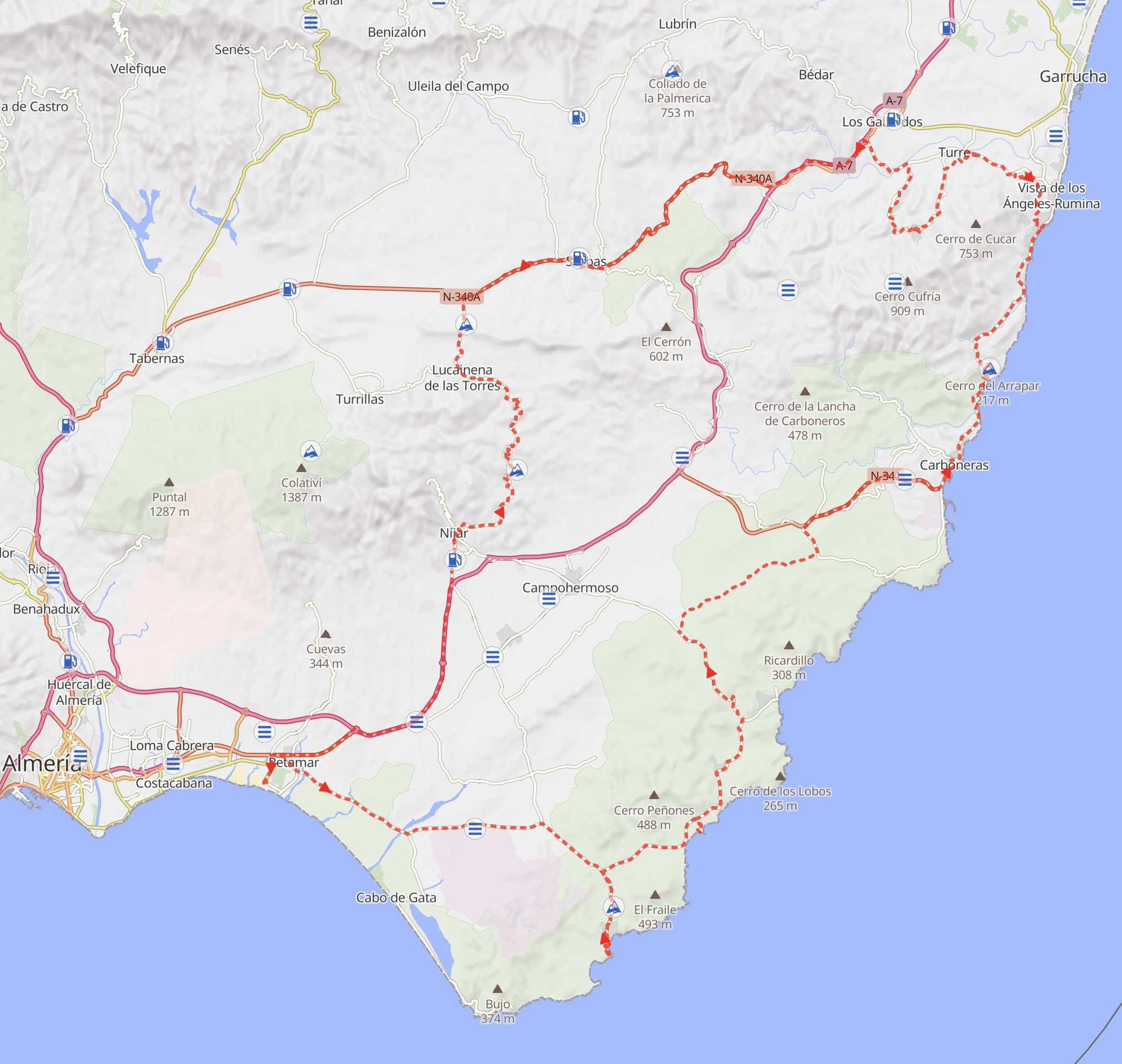 Olli und ich sind heute die letzten Mohikaner, der Rest gespannt heimwärts, fährt zum Gespann, gibt sein Moped ab oder lässt es wieder nach Hause transportieren. Noch nach Granada? Das wäre doch zu stressig. Olli hat da mal was zusammengeklickt, also nochmal Cabo de Gata bereisen.