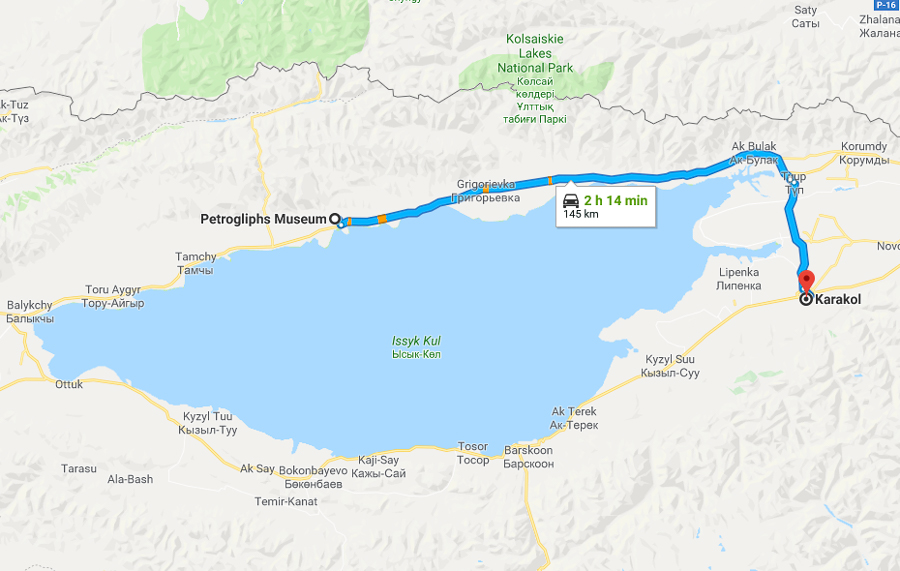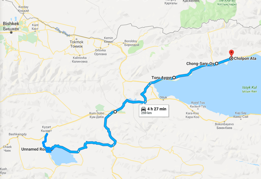 Ich bin ja noch die Strecke auf der Karte schuldig. Kommt dieses mal auf zweimal, anders ging nicht, weil Google die Straße, die ich zum Song Kol See gefahren bin, nicht kennt.
