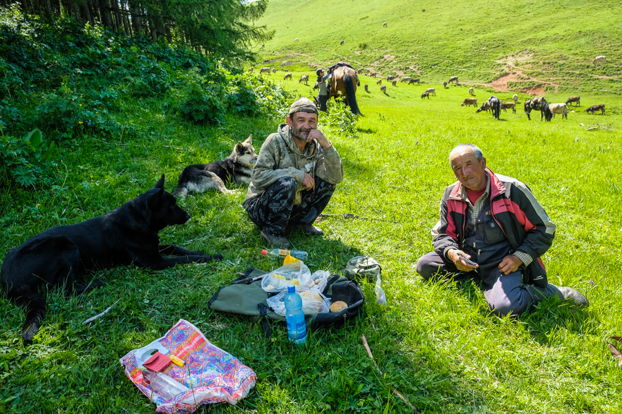Irgendwann riefen die Hirten zu mir rüber und winkten, ich solle zu Ihnen rüber kommen. Nachdem sie ihre wunderschönen großen und angsteinflößenden Hunde zurückgepfiffen hatten, nahm ich ihr Angebot gerne an. Sie luden mich zu ihrem Essen ein und ich war sehr froh, dass ich meinen geräucherten Käse und etwas Brot beisteuern konnte. Ich bekam, etwas von ihrem Brot, gekochte Kartoffeln und einen hervorragenden Schweinespeck. Sie glaubten anfangs, dass der Käse aus Deutschland sei und waren verwundert wie ich Ihnen sagte, dass ich ihn in Karakol gekauft hatte. Sie haben ihn blitzschnell aufgegessen.