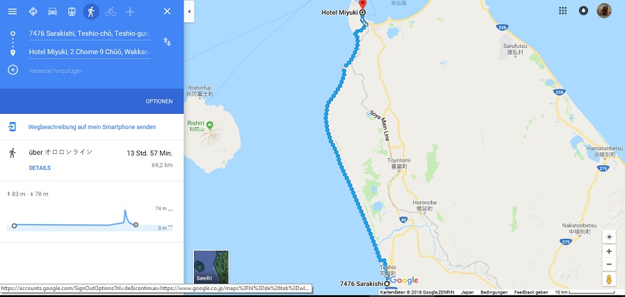 Kurz vor Wakkanai geht es dann noch über einen Hügel und dann erstmal in die goldene Möwe, warm essen und umziehen.