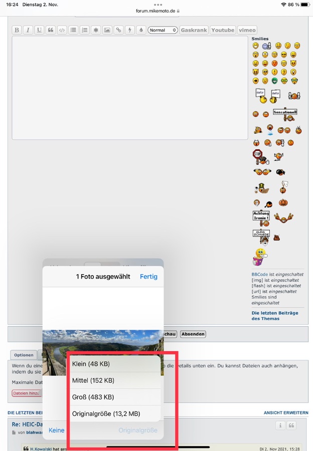 H.Kowalski hat geschrieben: Dienstag 2. November 2021, 15:28 …, allerdings erübrigt sich dadurch nicht die Nachbearbeitung (zumindest Verkleinerung) vor dem Hochladen des JPEGs, weil die Datenmenge beim Upload von der Forumssoftware aus limitiert ist.