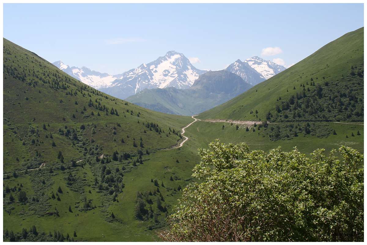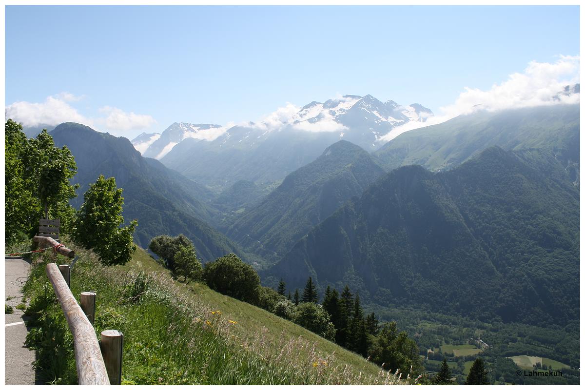 Auf dem Weg nach Alpe d'Huez kommt mir eine Nebenstrecke, der Col du Solude, unter die Räder und belohnt mich mit einer kurvenreichen und fein geschotterten Abfahrt ins Tal mit tollen Ausblicken in Richtung Alpe d’Huez.