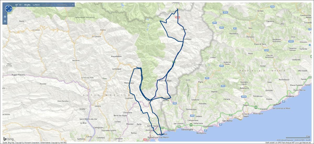 Nach einer herrlichen Rückfahrt stelle ich oben am Turini fest, dass mein Tank für den morgigen Tag nicht mehr ausreichend befüllt ist und ich vermutlich auf der Strecke, die morgen vorgesehen ist, keine Tankstelle finden werde. Was bleibt mir also anderes übrig, als nochmal nach Sospel zum Tanken zu fahren. Meine kleine Tankrunde bringt dann ausgesprochen kurvige 50 KM zusammen.