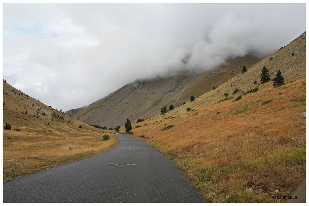 Auch auf dem Col de Rousset empfängt mich ein jämmerlicher Regen gepaart mit schneidend kaltem Wind. Ich zwinge mich dazu, zumindest solange auf ein offenes Wolkenfenster zu warten, bis ich ein halbwegs akzeptables Foto von der Kehrenfolge des Passes eingefangen habe. Aber ansonsten habe ich die Nase gestrichen voll.