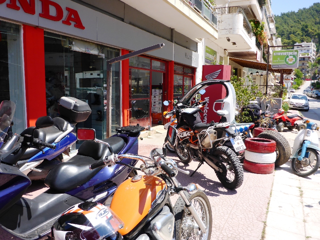 Für 20 € hat mir die Hondawerkstatt in Igoumenitsa innerhalb kurzer Zeit das Vorderrad aus- und eingebaut und einen neuen Schlauch montiert.