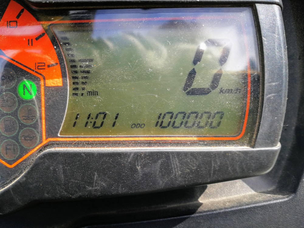 Gestern war es so weit. Nach 4 Jahren und 2 Monaten in meinem Besitz hat meine 990er die 100.000km Marke überwunden 8-) Übernommen habe ich sie damals mit etwas über 8000km auf dem Tacho. Also jetzt über 90000km selber gefahren. Sie hat mich bisher Pannenfrei überall hingebracht wo ich es wollte. Bis auf eine regelmäßige Wartung und Pflege, die bei den 99Xern wirklich wichtig ist, hat sie ansonsten keine größeren Probleme bereitet. Das einzige mal wo ich an ihr etwas gezweifelt hatte, war letztes und vorletztes Jahr als die Drosselklappensensoren und der Stellmotor nicht mehr so wollten :( Aber dank einer fähigen Werkstatt wurden auch diese Probleme behoben und sie fuhr danach auch wieder ohne weitere Probleme. Außer den üblichen Verschleißteilen die ich in der Zeit wechseln musste (Kette, Reifen, etc.) wurden nur mal die Wasserpumpe (eingelaufene Welle bei 71tkm), die erwähnten Drosselklappensensoren + Stellmotor(63+74tkm) und die Radlager (vorsorglich bei 92tkm getauscht) gemacht. Kurz vor den 100.000km habe ich ihr nochmal frisches Öl mit Filter spendiert ;) Somit stehen weiteren hoffentlich vielen Kilometern nichts entgegen DD
