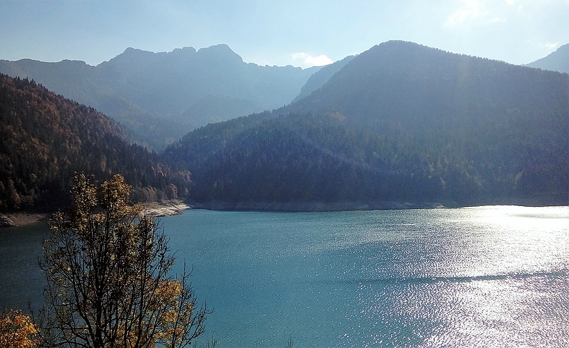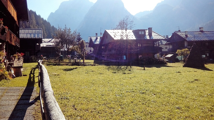 Ich hatte aber noch eine Verabredung mit der Forcella Lellma. Also am Handy einen einzigen Wegpunkt gesetzt und los. Google Maps lotst mich über kleine Sträßchen nach Sauris die Sopra und da eine Steile Hofeinfahrt hinauf. Hinter dem Hof geht ein Sträßchen, asphaltiert aber sehr sehr Steil, den Berg hinauf. Ich bleibe im 1. Gang und kreische so ca. 2 Km bergauf. Dann ist ein elektrischer Viehzaun quer über die Straße gespannt. Rechts mit einem Haken an einem Pfeiler eingehängt. Also stehen geblieben, Vorderradbremse gezogen und mit Links nach dem Haken gegriffen. Der hat sich aber langsam entfernt. Also fester am Bremshebel gezogen, hat aber nix genutzt, der Haken hat sich trotzdem entfernt. Das Vorderrad und damit das ganze Moped ist langsam nach hinten gerutscht. Auf Asphalt! Das war der Moment wo mir der Schmäh ausgegangen ist. Man muss einfach seine Grenzen akzeptieren. Also ganz vorsichtig umgedreht und wieder runter den Berg. Noch ein Foto vom Lago di Sauris im Gegenlicht und zurück ins Hotel.