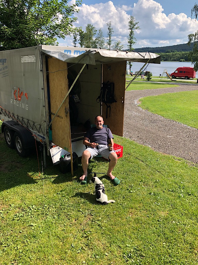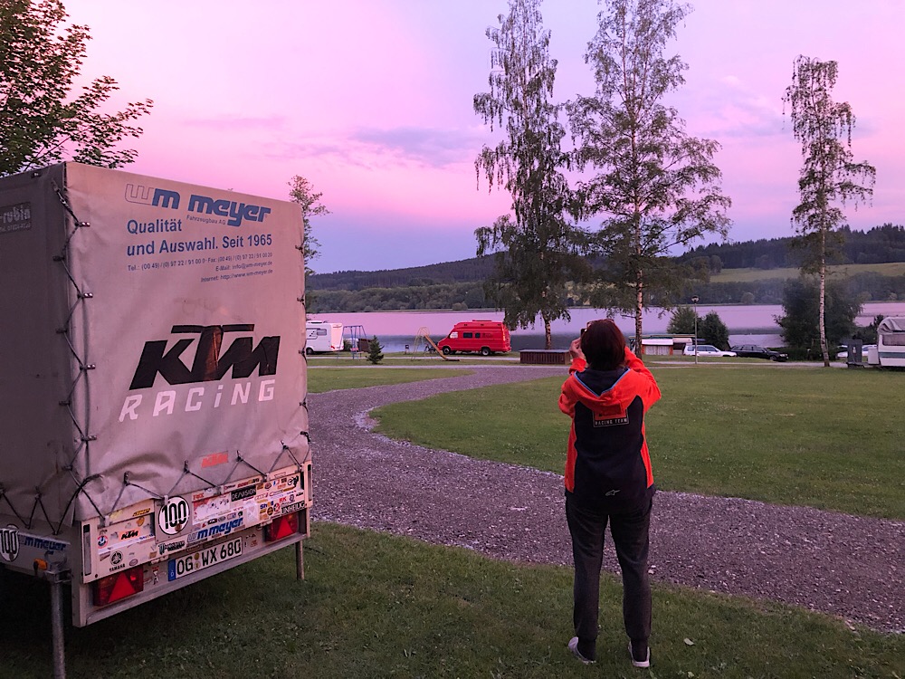 Den Sonntag haben wir als Tourtag gewonnen : ich habe am Montag Kundentermine bei Kulmbach, das ist nur 80 km entfernt. Wir fahren nicht heim, sondern gehen auf einen Campingplatz und ich besuche die Kunden von dort aus, meine Kollegen holen mich auf der Anfahrt ab. Der Sohn wird in den Zug nach München gesetzt. Wir sparen uns den mistigen Ferienende-Verkehr mit garantierten Staus und ich muss nicht am Montag wieder um 4 Uhr aufstehen, um nach Oberfranken zu fahren. Guter Plan.
