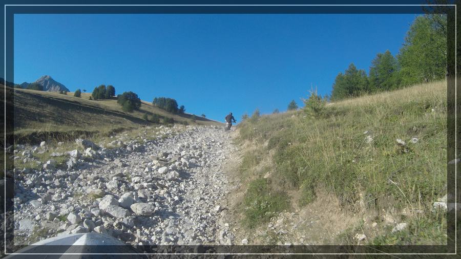 Danach fahren wir wieder hoch auf die LGKS und biegen am Col Ardente ab Richtung Osten. Der Weg ist z.T. etwas gröber geschottert und windet sich am Hang entlang ohne nennenswerte Steigungen, so dass es keiner großen Anstrengungen bedarf.