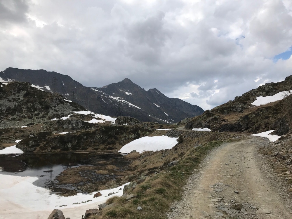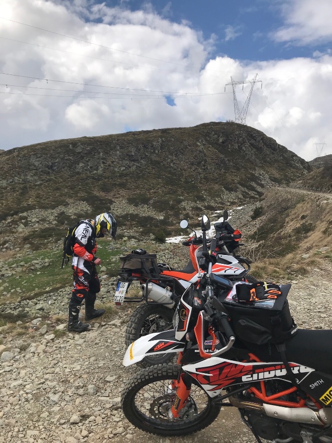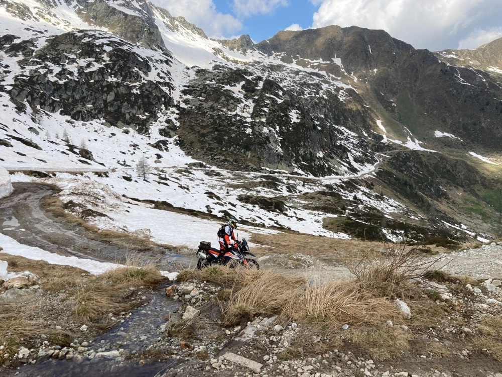 Ich war ein bissel nervös, weil es schon nach 16:30 war, also wir einstiegen. Wir hatten Hunger, keinen Proviant mehr und ich auf der 690er nur noch einen halben Tank voll Sprit. Im Etappenort Foppolo (ein weniger schöner Retorten-Ski-Ort mit Hotelburgen, grade alle leerstehend ...) war nirgendwo eine Möglichkeit aufzutreiben, die Durchfahrtsgenehmigung zu erhalten. Als wir an einem Hotel fragten, das uns angegeben wurde, hieß es nur, der Weg sei ohnehin nicht frei wegen Bauarbeiten und Schnees. Wir sollten einfach losfahren, interessiere sowieso niemanden. Na gut.