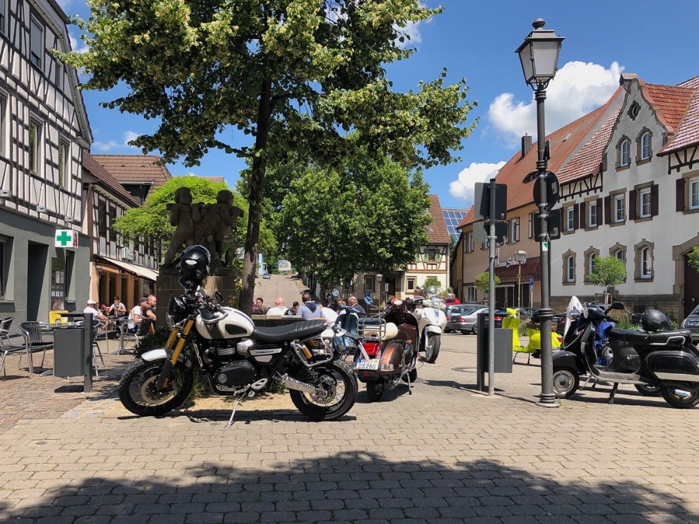 Vor Schwaigern bekam ich dann doch ein Hüngerchen und ein Dürstchen, das hieß entweder Rast zur Energiereproduktion oder mit trockener Kehle und Loch im Bauch weiterfahren. Irgendwie wollte ich nicht einkehren aber weiterfahren auch nicht. Also hab ich mich für ein Eis entschieden. Essen und trinken gleichzeitig in Form von drei Kugeln Eis, das sollte schon ein wenig vorhalten ?!? Im Eiscafe San Remo in Schwaigern hat das hervorragend geklappt. Jede der drei Kugeln hatte die gefühlte Größe eines Tennisballs. Dazu kam, der ganze Vorplatz des Eiscafés war fest in italienischer Hand. Allesamt waren die ca. 20 Kollegen mit ihren Piaggio Rollern zum fröhlichen Aperol Spritzz trinken erschienen. Buon Giorno, Salute, Mamma Mia hallte durchgehend und lautstark über den Marktplatz. Mamma Mia, zeitweise wusste ich dann wirklich nicht mehr ob ich nicht doch irgendwie durch einen Riß im Raum-Zeit-Kontinuum in Italien gelandet bin. Aber so konnte ich das Ambiente noch mehr genießen. :hug