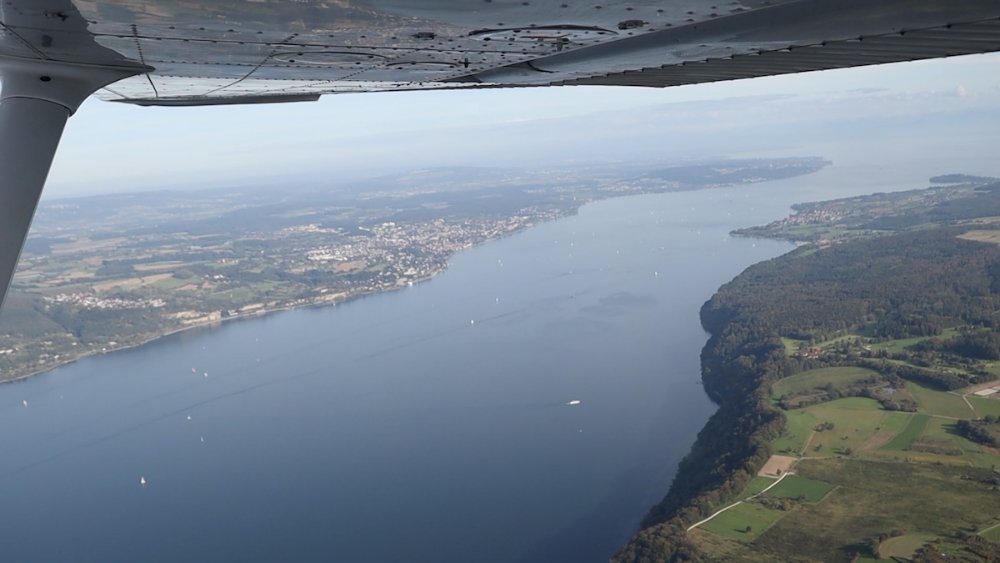Wir hatten uns im Vorfeld über die mögliche Route für den heutigen Samstag unterhalten. Einen Alpenüberflug hatte ich vorgeschlagen, vielleicht nen kleinen Zwischenstop in der Schweiz? Zu normalen Zeiten wahrscheinlich kein Problem. Nachdem die Schweiz kurz zu vor neue EInreiseregeln aufgestellt hatte, hatten wir auf die ganze Bürokratie bei der Landung keine Lust. Also lieber im Ländle bleiben. Bodensee? Bodensee! Ich kenne den Bodensee bisher nur vom Ufer aus, wo mir meistens Touristenmassen auf den Sack gehen - außer im Winter. Aber von oben betrachtet hat der See was beruhigendes. Nicht nur optisch, auch war der Flug über die Wasserobefläche von den Luftbewegungen her endlich mal eine ruhige Angelegenheit. Das liegt an der gleichmäßigen Thermik über der Wasseroberfläche. Über der Landfläche wechseln ständig Wälder, Felder und versiegelte Flächen ab, was die Thermik ständig verändert und für Unruhe sorgt. Über dem See ein Genuss!