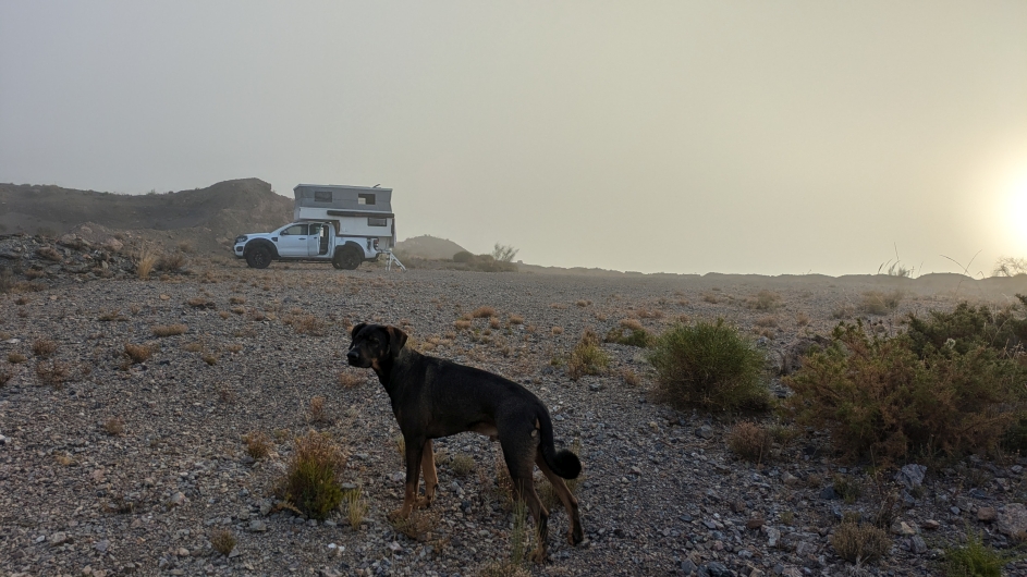 Motorisierung ist der 2.2L Turbo-Diesel mit 213 PS und 500Nm, Allrad ist zuschaltbar, Untersetzung ist zuschaltbar, Hinterachssperre ist zuschaltbar. Dazu jede Menge Gimmicks, also Fahrassistenzsysteme, und Komfort-Features - ich glaube der kann sogar selbst einparken. Das Fahrwerk ist von Oldman EMU, einem australischen Fahrwerksspezialisten. Der Ranger steht auf 20 Zoll LM-Räder mit der typischen BF-Goodrich AT Bereifung. Die Doppelkabine, also mit menschenwürdiger Rückbank, musste sein, da wir für Jerry (71 cm Schulterhöhe) Platz brauchten. Ich habe die Rückbank entfernt und durch eine Holzplatte ersetzt. Auf dieser Plattform habe ich dann hinter dem Fahrersitz noch ein Regal für 3 Euroboxen gebaut.