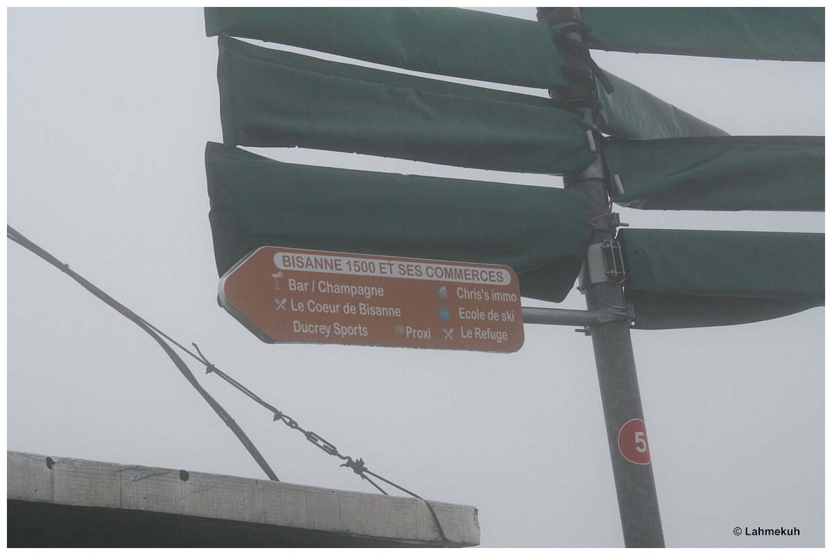 Am Signal de Bisanne spüre ich das erste Mal, wie es sich anfühlt, wenn man eigentlich blind durch die Gegend fährt. Abenteuerlich! Wenn ich sowieso nichts sehen kann, warum drehe ich nicht einfach um? Gute Frage, nächste Frage! Die Antwort gebe ich mir gleich selbst: ich möchte zumindest das Hinweisschild auf die „Kamikazepiste“ fotografieren, das ich mal in einem Reisebericht von – ich glaube, Andre war es – gesehen habe. Also weiter. Der Erfolg meiner Mission tendiert jedoch gegen null.