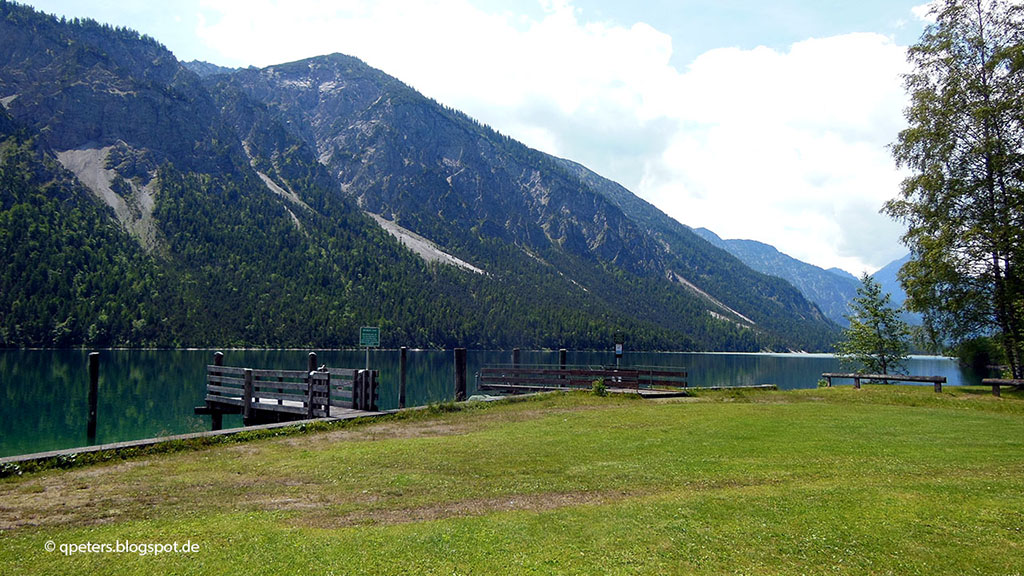 Trotz gemütlichem Tourenfahren waren wir gut vorangekommen, so dass wir in Krün entschieden, unsere Runde etwas auszudehnen und zum Plansee zu fahren. Wunderbar lag die Zugspitze vor weiß-blauem Himmel vor uns, als wir Garmisch-Partenkirchen erreichten. vorbei an der Skisprungschanze und mitten durch die Stadt ging es weiter Richtung Ehrwald. Auch hier muss mit erhöhtem Auftreten von blitzern gerechnet werden. Eine schöne Einnahmequelle für die Orte. von Ehrwald aus fuhren wir auf der B179 in dichtem Verkehr bis Reutte, wo wir endlich wieder auf eine kleinere Straße abbiegen konnten. Die L255 führt geschwungen zum Plansee, der - wie der Name schon sagt - heute absolut plan und glatt in die Berge eingebettet ist. Kurvig fährt man viele Kilometer am Nordufer entlang bis zum Ort Plansee. Dort machten wir fast direkt am See eine Kaffee- und Eispause. Vorhergesagt waren für diesen Nachmitte schwere Gewitter aus Nordwesen und beim Blick auf den Himmel beschlossen wir nach einer halben Stunde auf zu brechen.