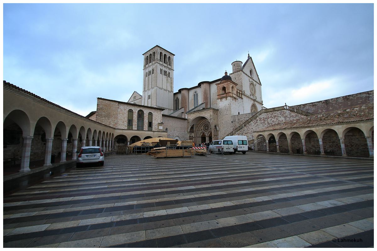 Angekommen in Assisi machen wir uns natürlich auf den "Touristenpfad". Dabei beobachten wir einen in Lumpen gekleideten Büßer, wie er quer durch Assisi zunächst auf den Knien, später dann ab dem Platz der Basilika San Francesco auf allen vieren seinen Weg unbeirrt von Passanten und Fahrzeugen bis hin zur Basilika bahnt. Wie wir in einem Cafe erfahren, vollzieht der Büßer dieses Ritual ohne Unterlass seit vielen Jahren an jedem Freitag.