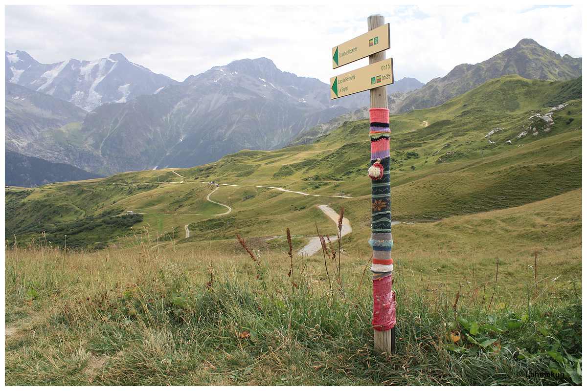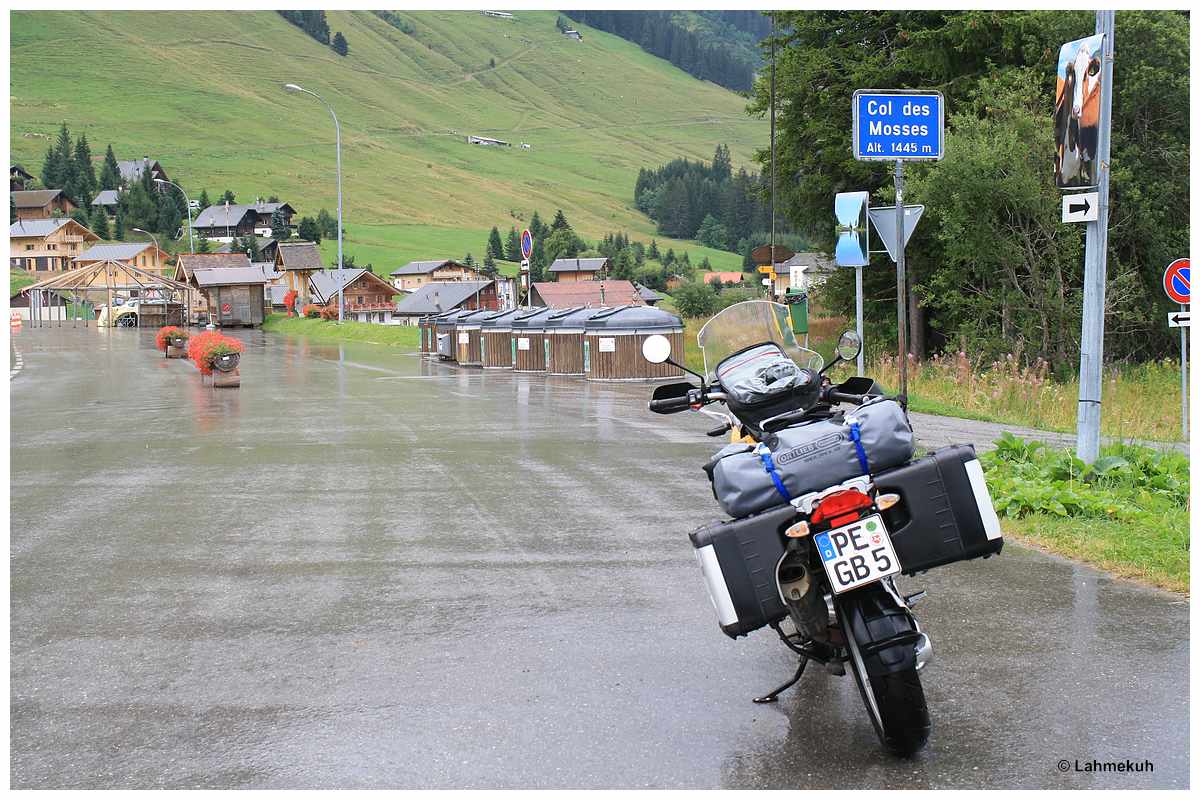 Ich akzeptiere die Sperrung und kehre zurück auf die heutige Route, auf der ich geraume Zeit noch mit mäßigem Wetter begleitet werde. Dennoch schaffe ich es, die langsam vorbeiziehende Umgebung zu genießen. Sowohl auf dem Colombière als auch auf dem Saises komme ich mit anderen Bikern in nette Gespräche. Die beiden Schweizer vom Colombière auf ihren amerikanischen Schwereisen werde ich im Laufe des Tages noch zwei weitere Male treffen. Man fährt halt irgendwie dieselben Straßen, wen wundert es?