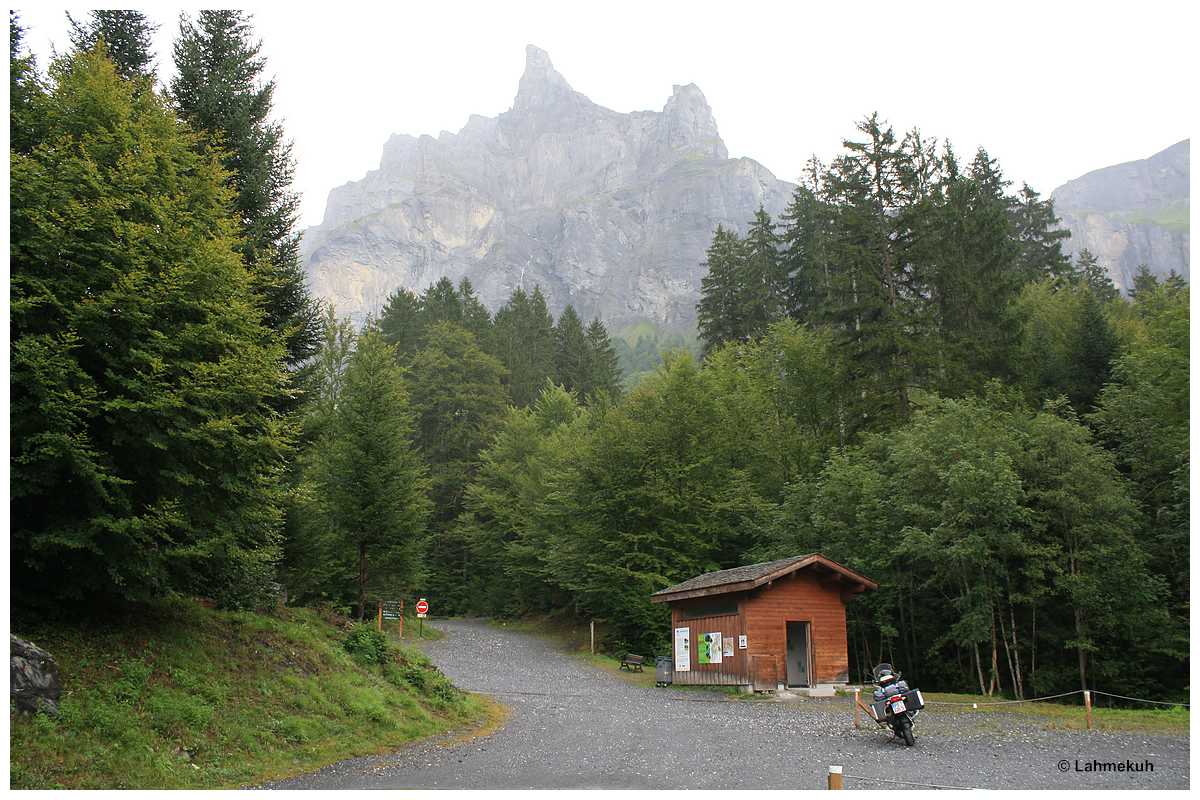 Nach dem Frühstück fahre ich dann von Samoens aus zunächst weiter in östliche Richtung. Am Ende der Straße soll das Bergmassiv einen beeindruckenden Wasserfall beheimaten. Diesen kann ich wegen des dunstigen Wetters mal gerade so ausmachen, weiteres Heranfahren bis zu einer Straßenschleife, die nah an dem Wasserfall liegen soll, wird mir durch Straßensperren nachhaltig verwehrt.