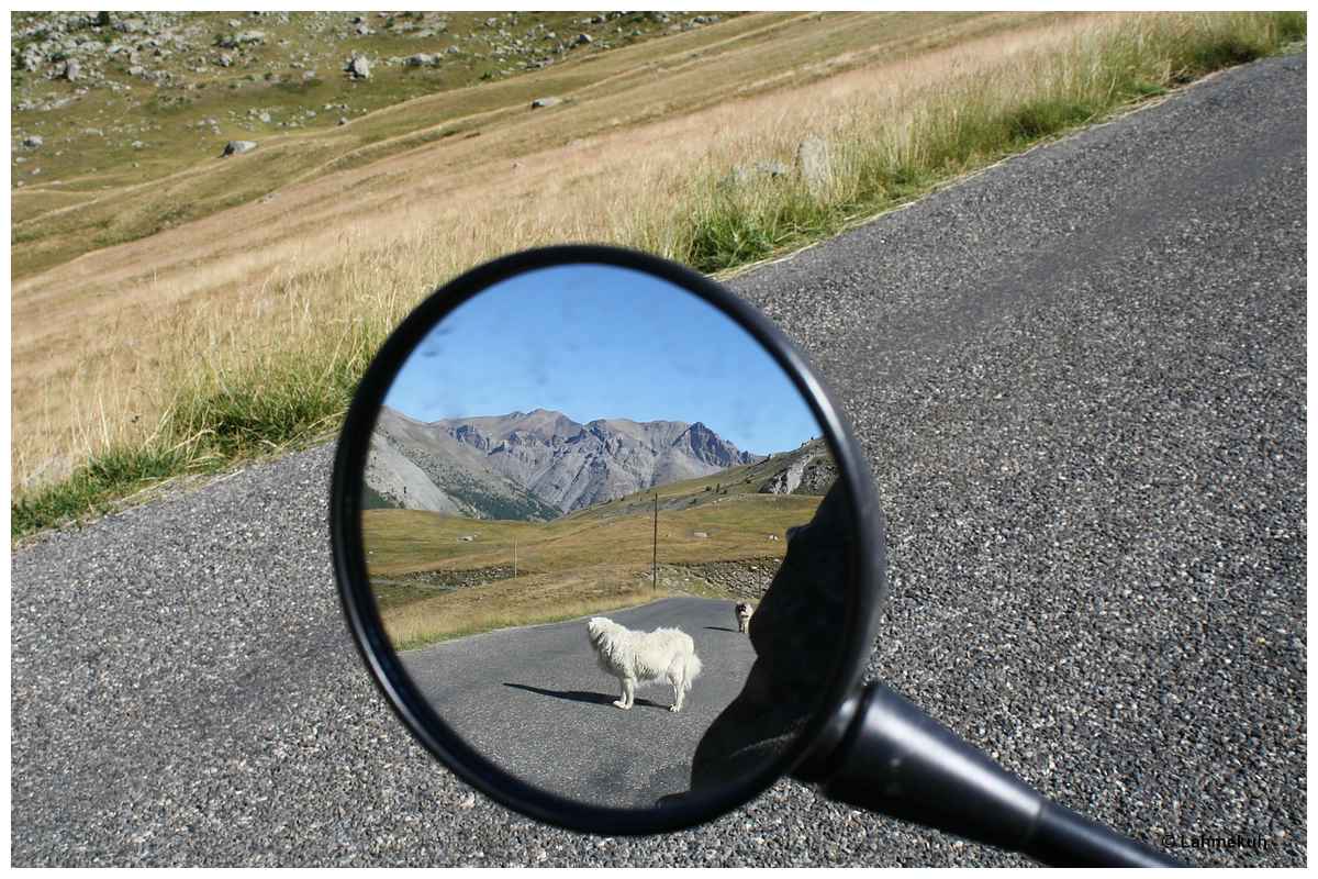 Aber auch die schönen Momente haben ein Ende und so begebe ich mich auf den Abstieg zum Moped und die Weiterfahrt in Richtung Barcolonette und den Col de Cayolle. Über eine Nobelkarosse der Marke mit der Emily wundere ich mich weniger als über den großen Reisebus, der sich auch am Cime de la Bonette einfindet.