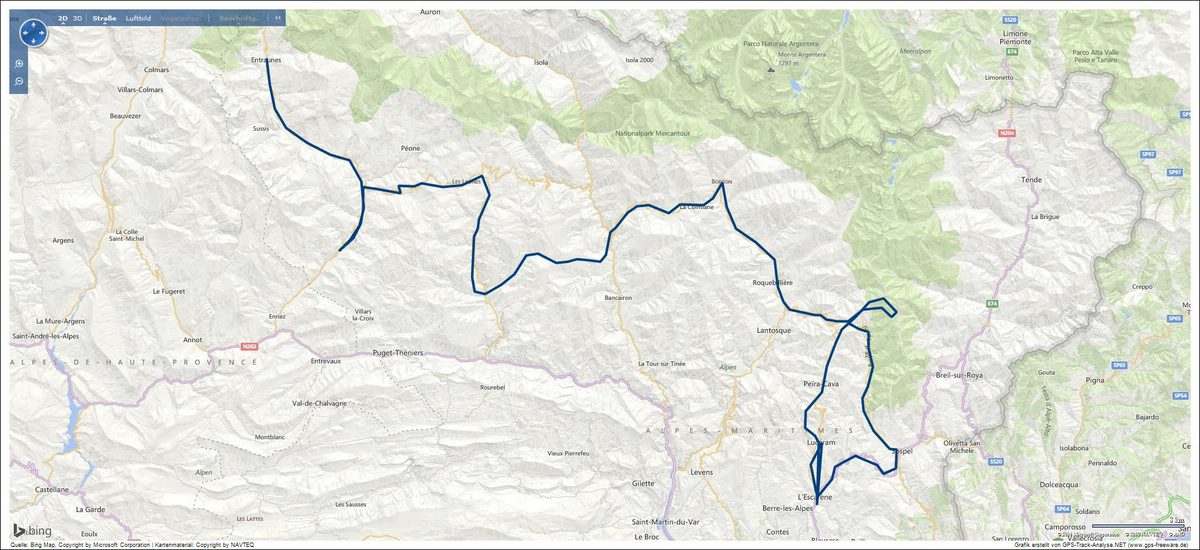 Entraunes - Gorges de Daluis - Col de Valberg - Col de Ste-Anne - Gorges Superiores du Cians - Col de la Sinne - Col St.-Martin près Valdeblore - Col de Turini - Fort Mille Fourches - Pointe des Trois Communes - Fort de la Forca - Baisse de la Cabanette - Col St.-Roch - Col de Braus - Col de St.-Jean près Sospel - Gorges du Piaon - Col de Turini