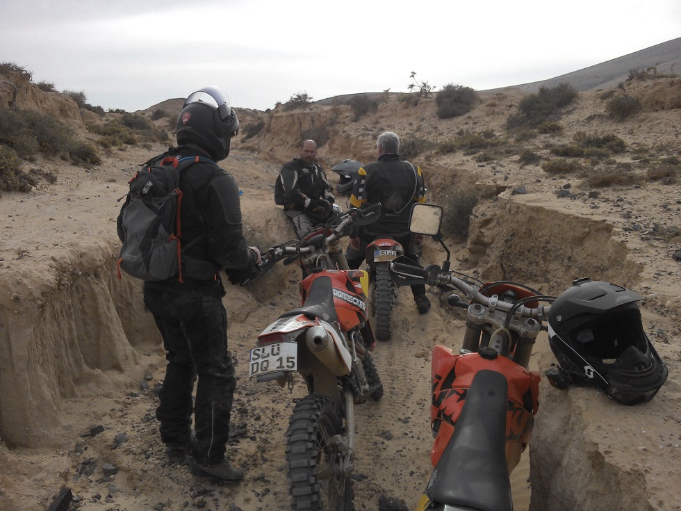 Und nun zum Fahren: Am ersten Tag ging es also zu fünft los. Bereit standen eine 530-er, eine 525-er und der Rest 450-er EXCs. Sie waren schon älter, die Reifen mehr als grenzwertig, aber zum Fahren sehr problemlos und vertrauenserweckend. Die Einweisung war recht kurz, am ersten Tag stand eine eher einfache Tour auf dem Programm. Für mich ok denn ich stufe mich endurotechnisch eher als Einsteiger ein und die Fahrpraxis ist Anfang März eher dürftig. Von Tag zu Tag wurde das Programm dann umfassender und schwieriger. Recht entspannt am Ufer entlang, schnelle Schotterpassagen, Schotter den Berg hinauf und wieder hinunter, das gleiche im Sand, Durchfahrten durch ausgetrocknete Bach- und Flussbetten etc.
