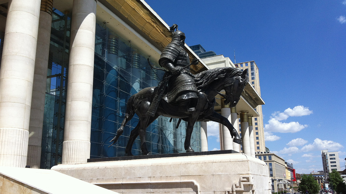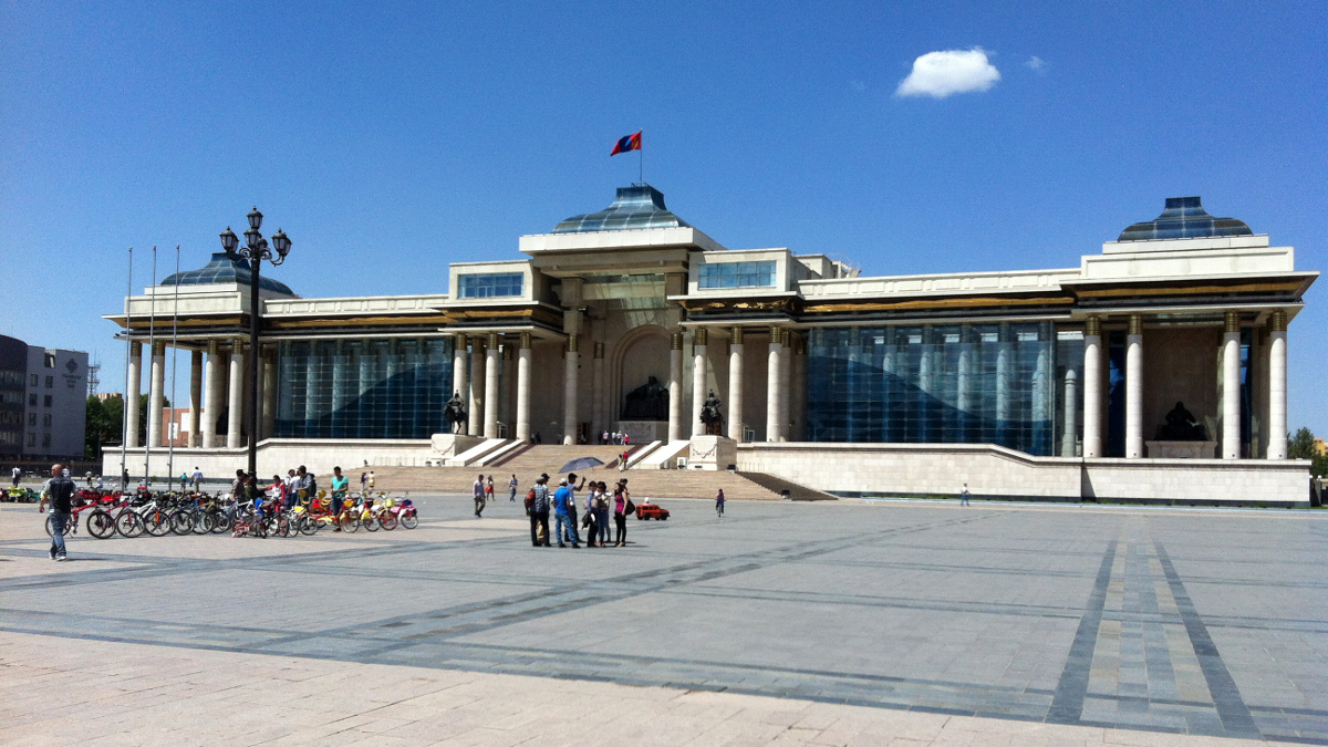Jagaa und unser Fahrer kutschieren uns über die erst kürzlich fertiggestellte Umgehungsstrasse zum Oasis wo wir die erste Nacht verbringen werden. Und noch viele Weitere, aber das ahnt zum dem Zeitpunkt noch keiner. Im Oasis angekommen beziehen wir unser Luxuszimmer und ich schiele verzweifelt Richtung Bett. Jagaa, der kleine mongolische Fiesling besteht jedoch darauf dass wir eine Stadtrundfahrt machen und uns ein Museum anschauen. Auch Wolf meint dass es besser wäre die Krise „auszustehen“ und es ein Fehler wäre jetzt schlafen zu gehen. Hab ich schon erwähnt dass ich müde bin und nur noch schlafen will?! Es wird schon seinen Grund haben warum die Mongolen die halbe Welt erobert haben und so wage ich nicht unserem Guide zu widersprechen. Nach einer (für mich) irren Fahrt durch den Verkehr der Haupstadt kommen wir beim grossen Platz des Regierungsgebäudes an. Ich habe auch nach unzähligen Stunden Autofahrt in der Mongolei nicht verstanden wie der Verkehr so „geordnet“ fliessen kann. Da wird von allen Seiten reingedrückt und wild gehupt, frei nach dem Motto… wer bremst verliert, wer nachgibt hat schon verloren. Unglaublich dass und wie das trotzdem funktioniert. Nach dem Besuch des Regierungshauptsitzes fahren wir zum Museum. Ich schleppe mich die fieserweise unterschiedlich hohen Treppenstufen hoch und falle mehr als einmal beinahe auf die Schn… Nase. Wie durch Watte höre ich Jagaa zu der wirklich Vieles und viel Wissenswertes über die Geschichte der Mongolei zu erzählen weiss. Hab ich schon erwähnt dass ich müde bin und endlich schlafen will?! Irgendwann habe ich meine Krise überwunden (hatten die Kerle doch recht) und wir fahren zu einem Einkaufscenter um einen Mobile-Datastick für Wolf zu besorgen. Leider gibts das so nicht zu kaufen und so besorgen wir uns für wenig Geld eine mit 10GB Datenvolumen geladenene SIM-Karte. Da Wolf in seinem MacBook keinen SIM-Kartenslot hat (für mich als Informatiker unbegreiflich) beschliessen wir die Karte in meinem iPad Mini zu verbauen welches ab da als HotSpot fungiert. Danach fahren wir in ein Mongolian Barbecue Restaurant wo es lecker Essen mit Showeinlage gibt. Auch wenn beim hantieren und rumhampeln des Kochs die Hälfte des Essens als Verlust abgetan werden muss da es irgendwo in einer Ecke oder auf dem Boden landet macht es Spass dem Meister bei der Arbeit zu zuschauen. Abgesehen davon war das Essen wirklich top und sehr abwechslungsreicht. Leider nahm an diesem Abend und bei diesem Essen auch die Sache mit dem Bier ihren Anfang… aber das ist eine andere Geschichte.
