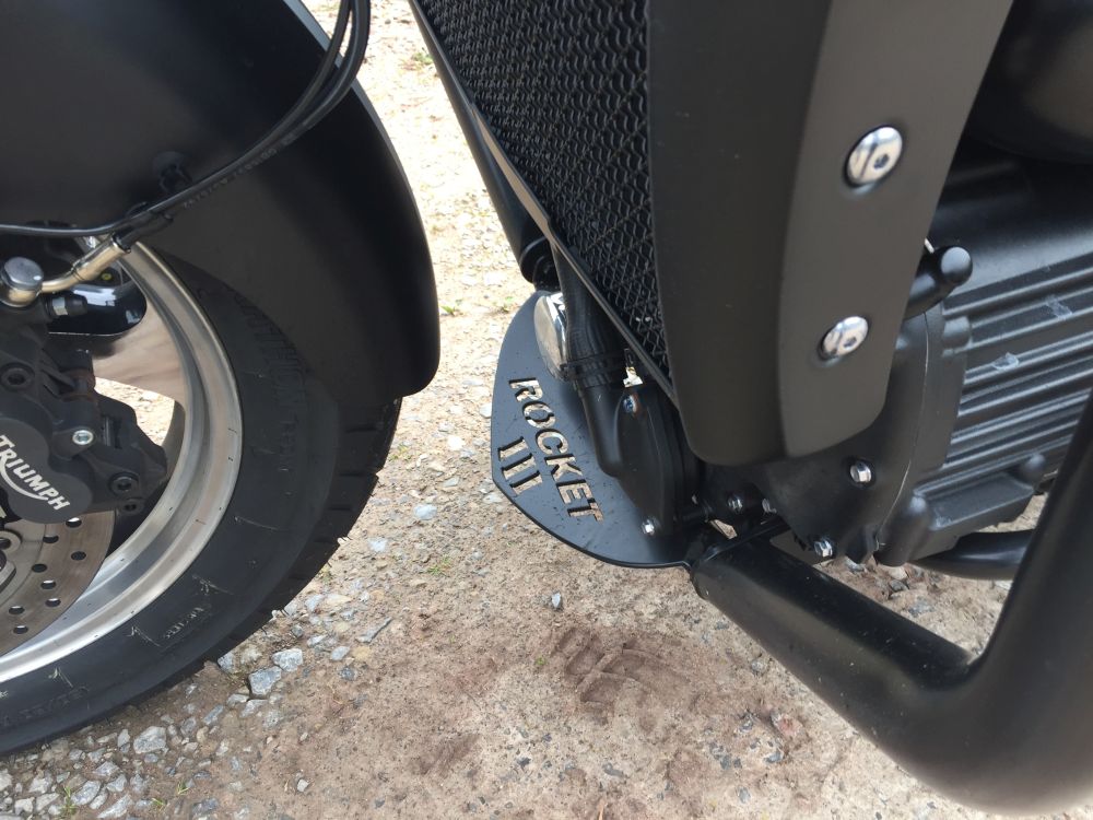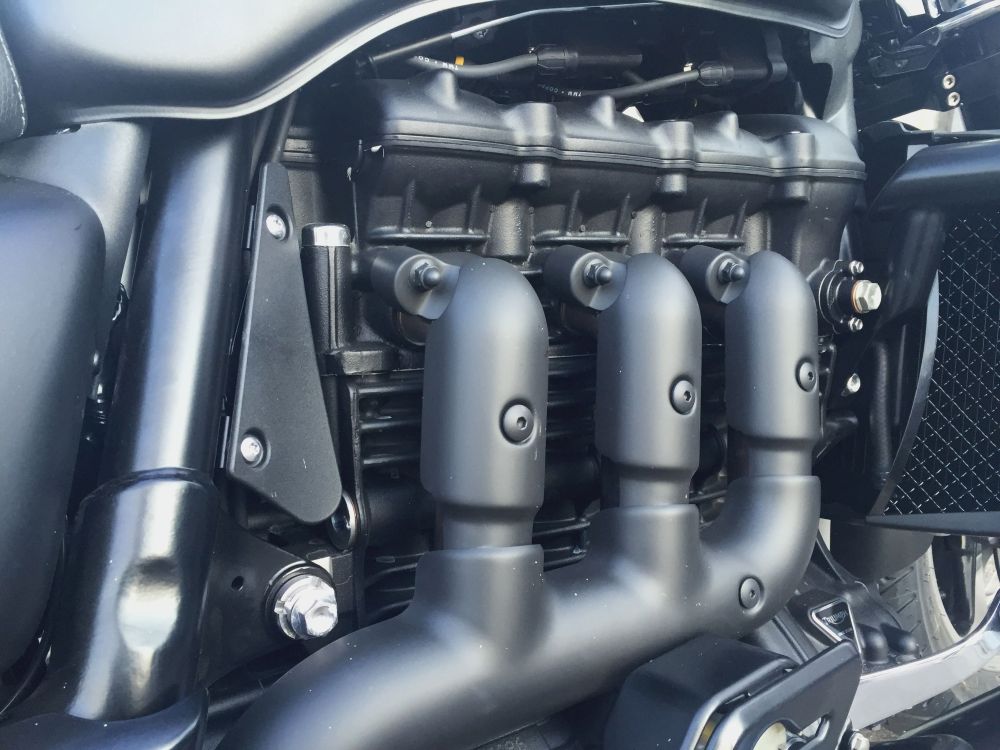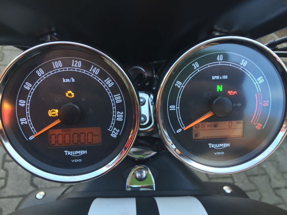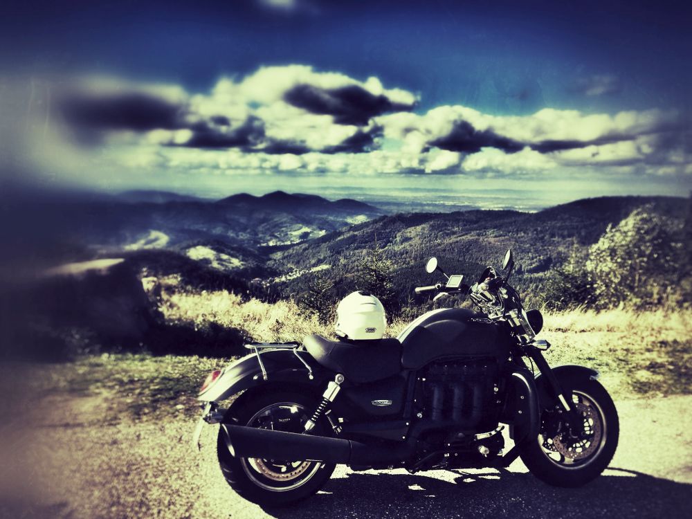Eine Woche später, Samstag, 10:00 Uhr, bereitmachen zur Probefahrt. Bei trockenem und angesichts der Jahreszeit warmem Wetter steht die Rocket 3 Roadster in mattschwarz für mich bereit. Das Gerät sieht einfach so geil aus, ich freu mich schon wie Bolle. Ich habe eine Stunde, um sie auszuprobieren. Ich schwinge mein Bein über die breite Sitzbank und nehme Platz. Ein bequemer Sitz unter meinem Allerwertesten, vor mir der breite Tank, davor schöne Rundinstrumente und noch weiter vorne ein Vorderrad, das ungefähr so breit ist, wie das Hinterrad an meiner GS. Ich drehe den Zündschlüssel, das Mäusekino fährt hoch und voller Vorfreude drücke ich den Starterknopf. Und da ist sie, die geballte Kraft aus drei Zylindern bollert gemütlich-dynamisch los. Ich lege den ersten Gang ein und lasse mit Respekt die Kupplung langsam kommen. Erstaunlich vibrationsarm geht es los. Die Rakete ist einfacher zu manövrieren als ich mir vorher dachte. Nur mit meinen langen Beinen weiss ich nicht genau wohin. Ich hätte als Kind weniger Schwarzbrot essen sollen, und 1,90m hätten ja eigentlich auch gereicht. Egal, ich falte die Gräten weg und es geht in den ersten Kreisverkehr. Ohne besondere Anstrengung lässt sich die Rakete um das Hindernis bewegen, und wir verlassen die geschlossene Ortschaft. Ich drehe am Griff rechts, und es geht ab. Woooooooooow, das macht Spaß! Jetzt weiß ich endlich, wofür dieser Kinnriemen am Helm gut ist! Zwei, dreimal abbiegen, die Straße geht in schönen Schwüngen den Hügel rauf. Das ist das optimale Geläuf für die Rocket. Inzwischen haben sich auch meine Beine mit der ungewohnten Sitzposition arrangiert. Zeit für einen Bremstest. Im nächsten Industriegebiet mache ich zwei Vollbremsungen bis in den Regelbereich des ABS, aus 50 und aus 70km/h. Das Ergebnis ist mehr als zufriedenstellend. Die Stopper bringen die Fuhre, die insgesamt wohl so um die 480 Kilo wiegt, sicher, souverän und gut kontrollierbar zum stehen. Nun ist es leider schon Zeit zur Rückkehr, eine Stunde war abgemacht.