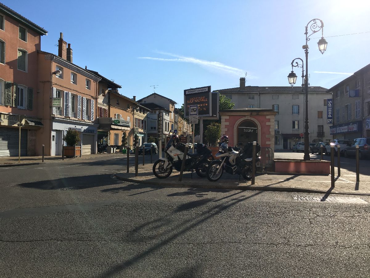 Eigentlich war das Ziel, mindestens auf Höhe Mâcon (südlicher Zipfel der Bourgogne) oder weiter südlich nach einem Campingplatz zum Abstellen Ausschau zu halten. Aber als das Wetter immer besser wurde, haben wir es bei Dole (Jura) schon nicht mehr ausgehalten und haben uns einen Campingplatz geschnappt. Ausladen, umziehen, losfahren! Wir sind noch rund 100 km bis Bourg-en-Bresse gekommen, dort Abstieg ins Hotel.