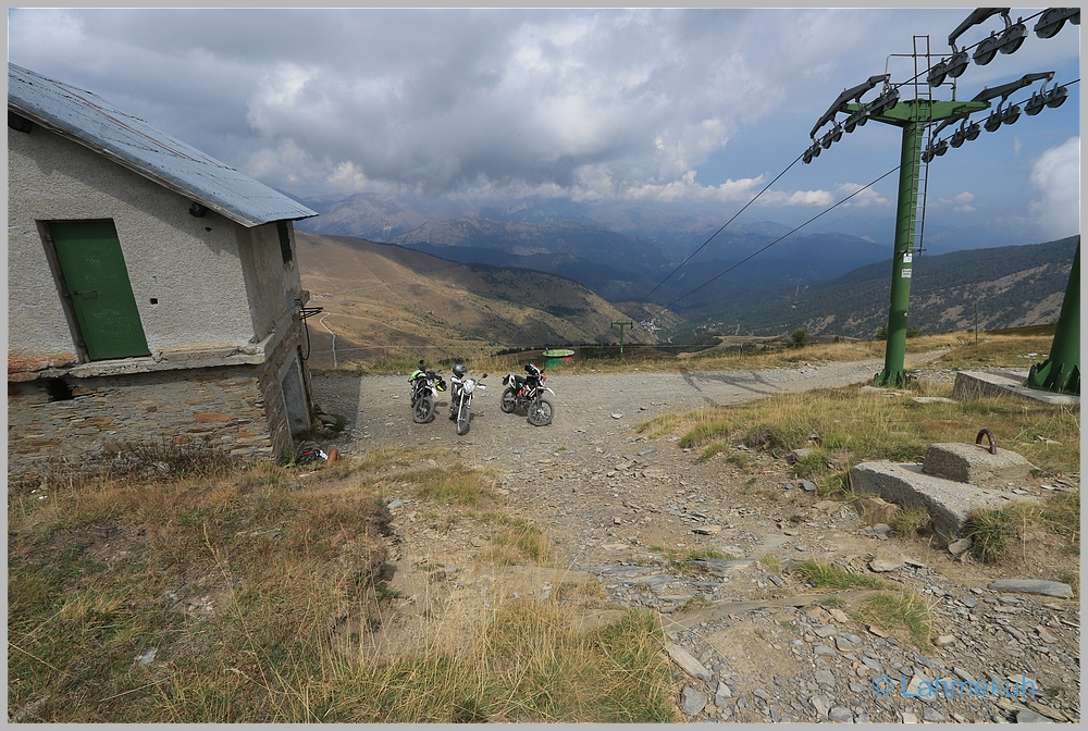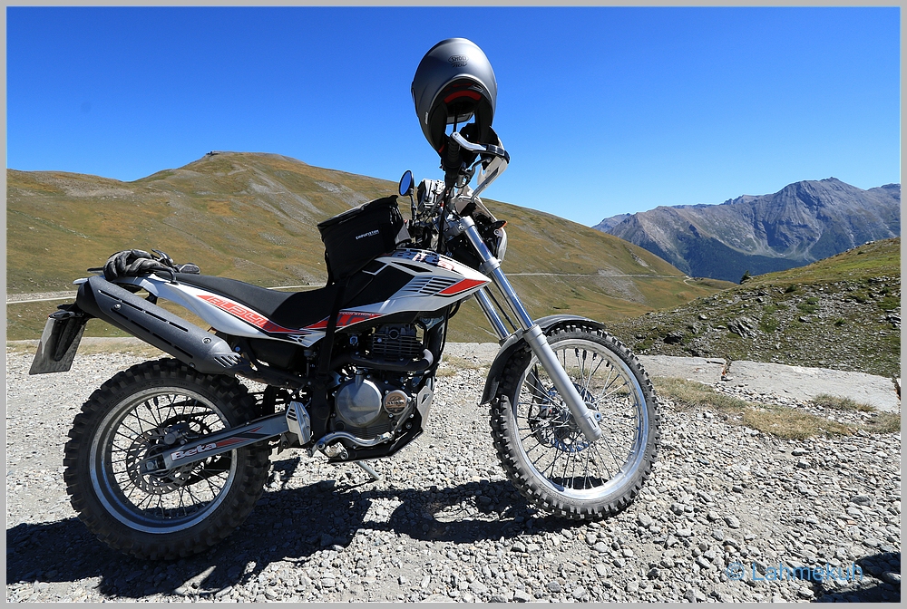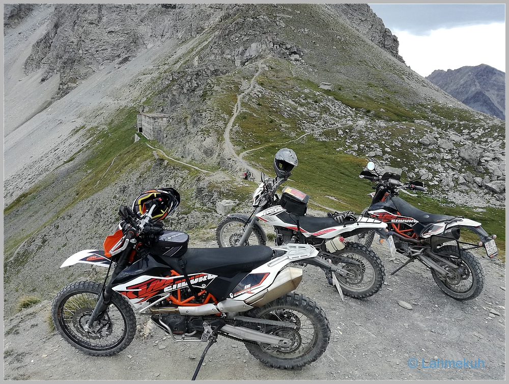 Am Vorabend wurden wir von einer Gruppe Enduristen, die ebenfalls im Gran Baita nächtigten, über den möglichen Einstieg in den Passo della Mulattiera aufgeklärt. Diesem Tipp folgend, ging es anschließend südöstlich von Bardonecchia am Forte Bramafam vorbei hinauf zum Objekt der Begierde. Im letzten steileren Teilstück der Auffahrt hatten wir alle drei das Bedürfnis, unsere Mopeds am Hang in eigenwilliger Weise zu parken. Gesagt, geparkt, jeder auf seine ganz individuelle Art und Weise. Fotos gibt es davon jedoch keine.