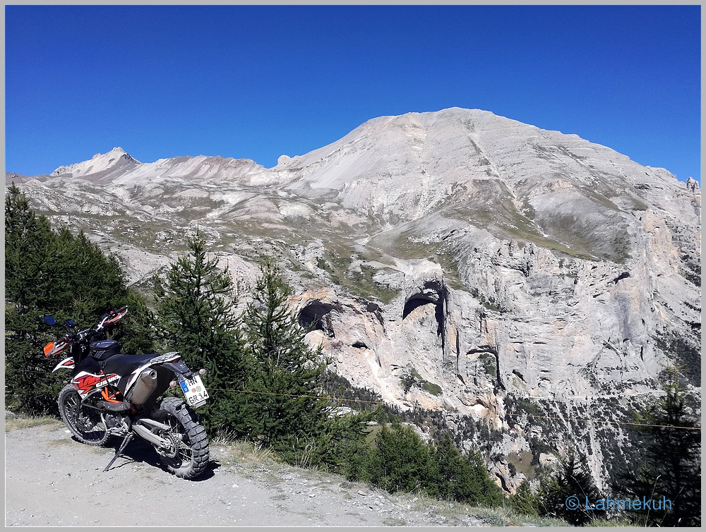 Sowohl Marc als auch ich hatten bei früheren Besuchen auf dem Cime de la Bonette unten im südwestlichen Tal eine kurvenreiche und offenkundig unbefestigte Straße wahrgenommen. Diese wollten wir unbedingt befahren. Der Weg führte uns also über den Col de la Lombarde nach Frankreich, sodann bei Saint-Étienne-de-Tinée über den Col d'Anelle hinauf zum Col de la Moutière. Von dort zweigt in westliche Richtung ein interessanter Wegeverlauf nach Bayasse an der D902 ab. Aber den haben wir uns für das nächste Mal aufgehoben. Weiter hoch ging es dann zum Cime de la Bonette, auf dem ich kurioserweise ein mir unbekanntes Bikerpaar auf zwei identischen BMW K 1600 GT traf, die aus meinem Nachbarort stammen. Die Welt ist ein Dorf!