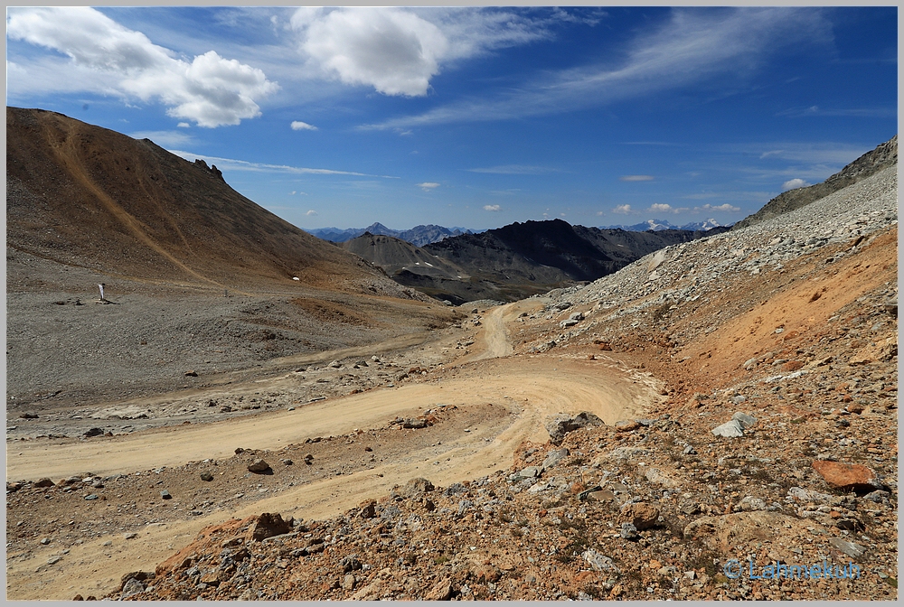 Im Hotel lagen verschiedene Karten aus, die den aktuellen Stand der legal befahrbaren unbefestigten Straßen aufzeigten. So überlegten wir uns, einem der Vorschläge zu folgen und zunächst durch das Valle Argentiera in Richtung des Gran Miol zu fahren. Die anschließende Fortführung der Route von Bousson in Richtung Thures und weiter zum Lago Nero erwies sich für mich als Neuling einigermaßen anstrengend und bekam von mir den Titel 'Durchschlageübung'. Zu meiner Beruhigung sagte mir der Marc hinterher, dass er den Abschnitt bei Thures auch nicht so ganz easy fand.