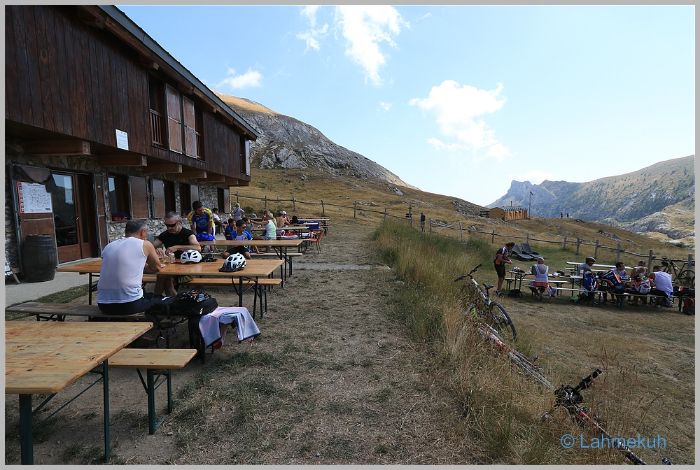 Nachdem sich Alen nunmehr zu uns gesellt hatte, sollte es am dritten Fahrtag auf den Colle Sommeiller gehen, gesagt, gefahren. Auf der Rückfahrt ein kleiner Abstecher zum idyllisch gelegenen Rifugio Scarfiotti. Da wir keinen Tisch reserviert hatten, mussten wir leider drinnen sitzen, schade, bei dem Ausblick!