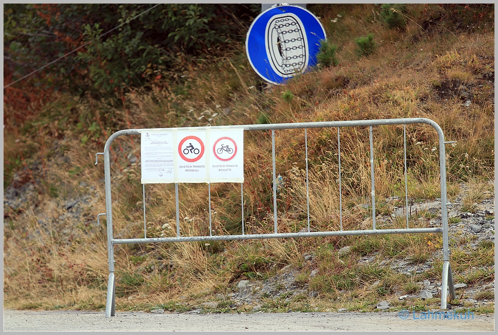 Über Claviere führte uns der weitere Weg indirekt in Richtung des Monte Jafferau. Indirekt deshalb, weil wir zunächst versuchten, den Passo della Mulattiera zu befahren. An dem uns bekannten Einstieg in den Aufstieg stand allerdings ein ernstzunehmendes Verbotsschild, dass uns davor warnte, diesen Weg bis 16.00 Uhr zu nehmen, da uns wilde Downhillpiloten begegnen würden. Angesichts der Uhrzeit beschlossen wir also das Ersatzprogramm: den Monte Jafferau.