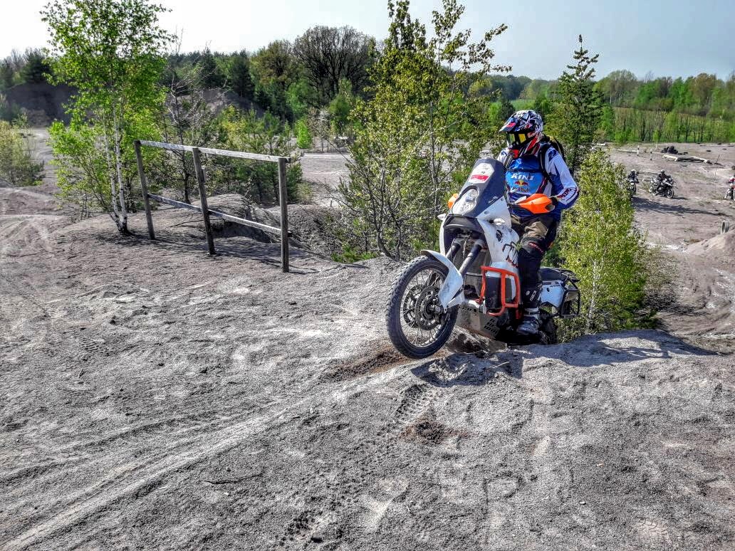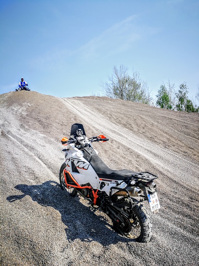 Nach der Mittagspause, die wie auch die Getränke, Obst und Snacks im Preis mit inbegriffen waren, ging es dann auf Feldwegen zurück auf´s Gelände. Hier wurden dann Beschleunigen und Bremsen mit hoher Geschwindigkeit geübt. Auch noch ein paar andere Übungen bis es dann über diverse Singeltrails mit Auf- und Abfahrten quer durchs Gelände zum Abschluss des Tages zum Kieshügel ging.