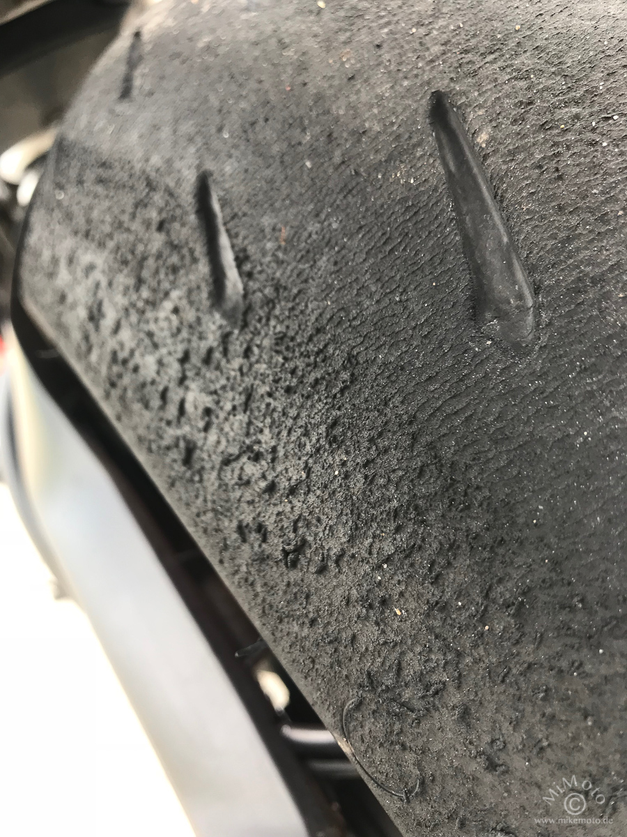Gripp, Einlenkverhalten, Gefühl zur Straße waren deutlich besser. Handauflegen und optischer Eindruck belegten, dass der Reifen schon nach wenigen Kurven deutlich mehr Temperatur aufbaute.