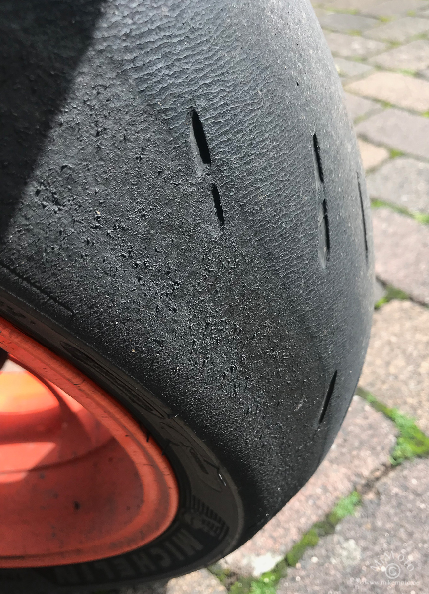Gripp, Einlenkverhalten, Gefühl zur Straße waren deutlich besser. Handauflegen und optischer Eindruck belegten, dass der Reifen schon nach wenigen Kurven deutlich mehr Temperatur aufbaute.
