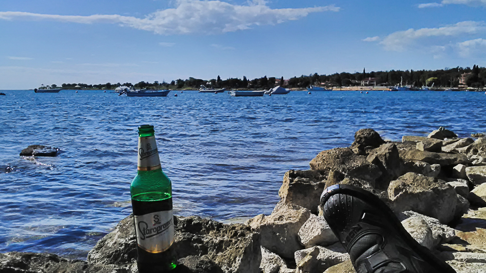 Nach 355km konnte ich um 16:30 Uhr meine Unterkunft beziehen in der Nähe von Novigrad beziehen und hatte noch genügend Zeit für ein Feierabendbier an der Küste.