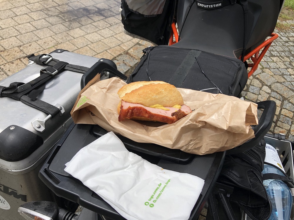 Brotzeitpause in einem oberfränkischen Dorf. „Leberkäs-Weggla“ – sehr lecker.